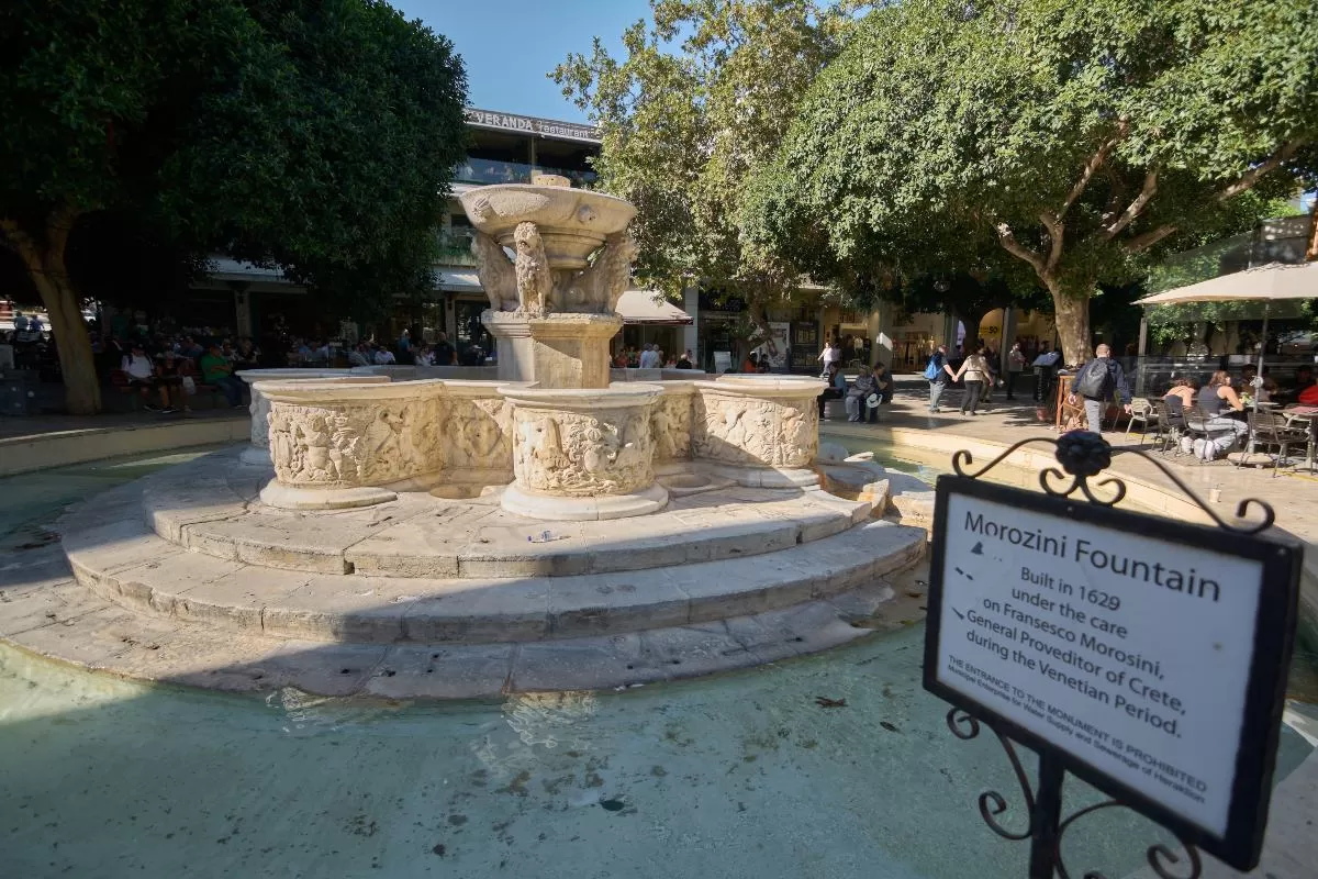 Λίγα μέτρα από την εκκλησία δεσπόζει το περίτεχνο σιντριβάνι, γνωστό ως «Λιοντάρια», με εντυπωσιακή γλυπτική διακόσμηση που απεικονίζει θέματα από το ζωικό βασίλειο και τη θάλασσα. Το σιντριβάνι κατασκευάστηκε στις αρχές του 17ου αιώνα από τον Φραγκίσκο Μοροζίνι, όχι μόνο για να ομορφύνει την πλατεία, αλλά και για να παρέχει πολύτιμο νερό στην πόλη. Η Κρήνη Μοροζίνι βρίσκεται στη πλατεία Ελευθερίου Βενιζέλου (κοινώς πλατεία Λιονταριών) και θεωρείται ένα από τα ελκυστικότερα ενετικά μνημεία του Χάνδακα (ονομασία του Ηρακλείου Κρήτης κατά τη Βυζαντινή περίοδο) και σώζεται σε πολύ καλή κατάσταση. Το νερό ερχόταν από το βουνό Γιούχτας στις Αρχάνες με ένα υδραγωγείο 15 χιλιομέτρων που έφτανε στο Ηράκλειο. Το μνημείο αποτελεί σύμβολο της πόλης του Ηρακλείου Κρήτης.