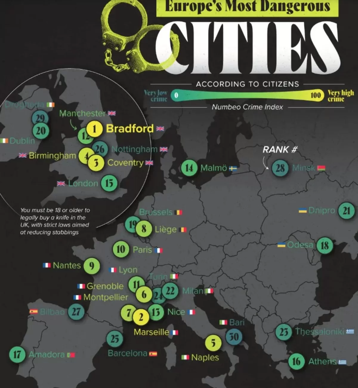Η πλειοψηφία της πρώτης 5αδας είναι βρετανική, με τις 4 από αυτές -Μπράντφορντ, Κόβεντρι, Μπέρμιγχαμ και Λονδίνο- να βρίσκονται στο Ηνωμένο Βασίλειο. Το Μπράντφορντ μάλιστα έχει δείκτη εγκληματικότητας 67,1, τον υψηλότερο δηλαδή στην Ευρώπη.