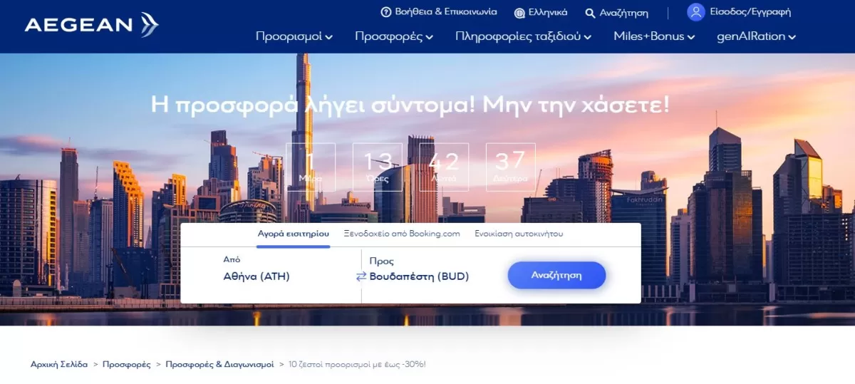 H Aegean ανακοίνωσε μόλις μια νέα προσφορά: Ταξιδέψτε με έκπτωση έως 30% στους προορισμούς του δικτύου στη Μέση Ανατολή και της Βόρεια Αφρική.