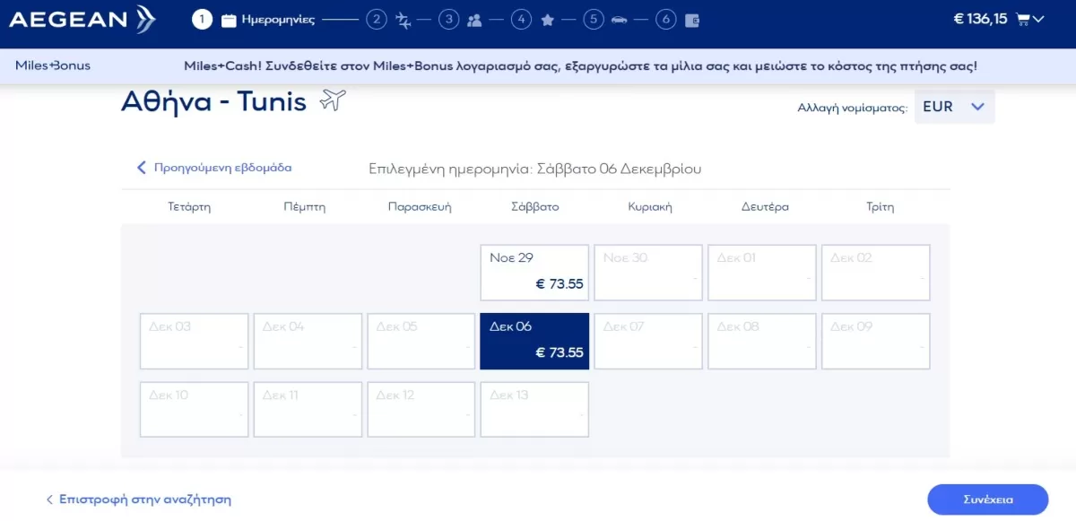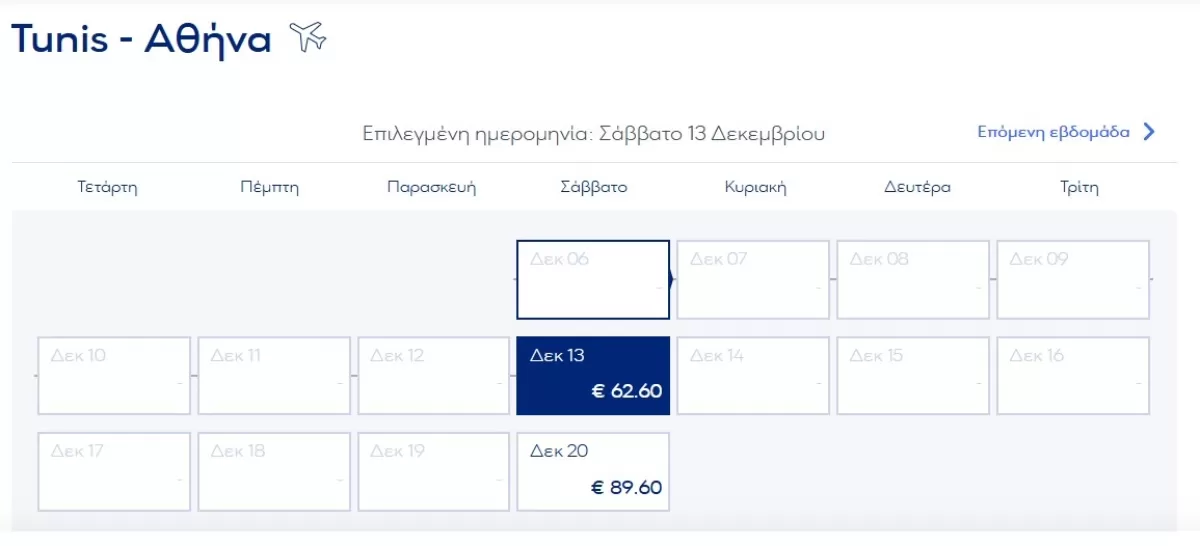 Ενδεικτικά κάναμε μια αναζήτηση για πτήση τον Δεκέμβριο από την Αθήνα στην Τύνιδα με επιστροφή και το εισιτήριο κοστίζει συνολικά €136,15, όπως βλέπετε και στους πίνακες που ακολουθούν. Η πτήση από Αθήνα για Τύνιδα στις 6 Δεκεμβρίου κοστίζει 73,55 το άτομο και αντίστοιχα μια πτήση επιστροφής (13/12) κοστίζει €62,60.