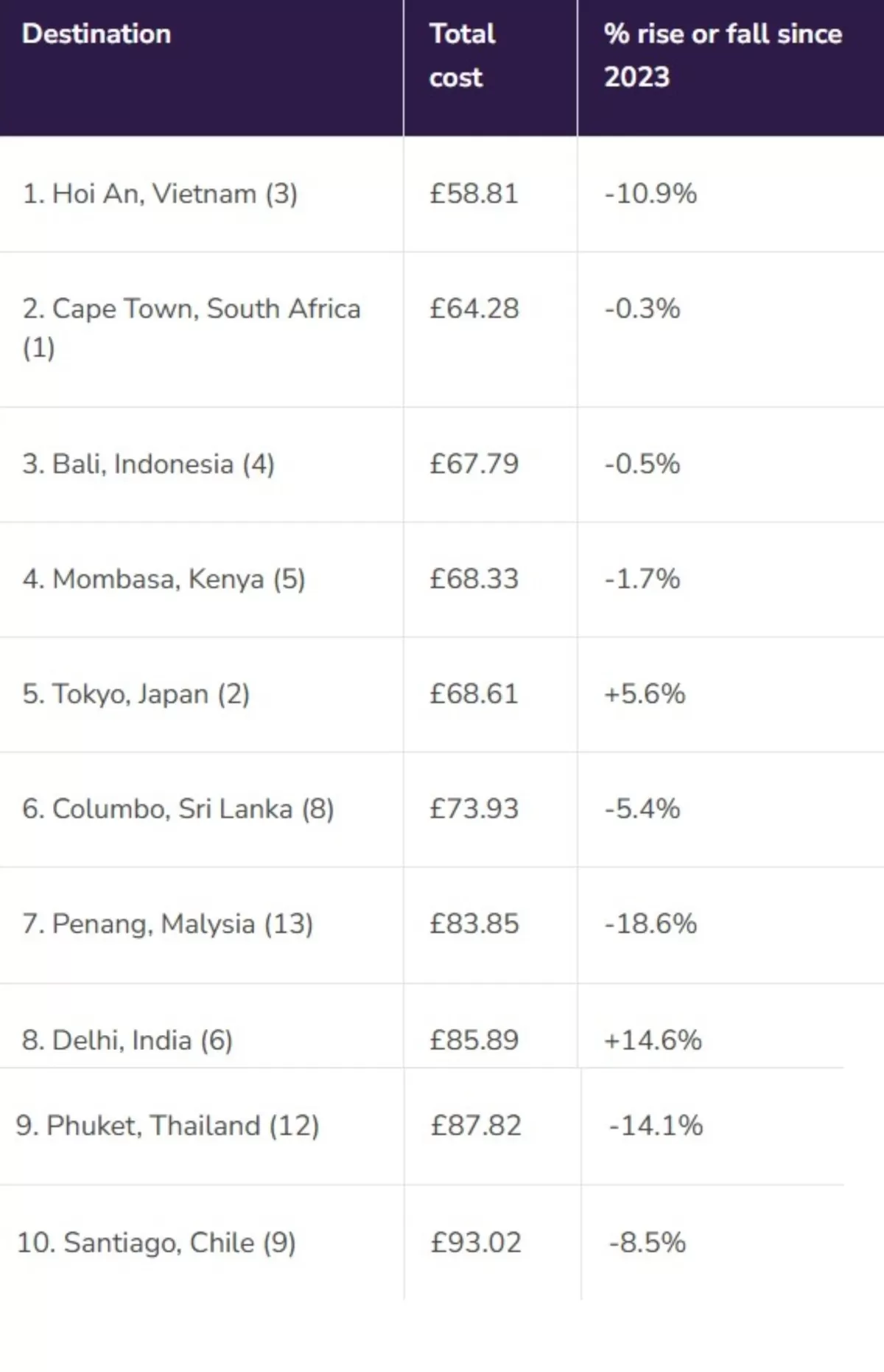 Την πρώτη θέση κατακτά το Χόι Αν στο Βιετνάμ (το οποίο επίσης κατέκτησε τον ίδιο τίτλο και το 2023). Εδώ, ένα βραδινό γεύμα τριών πιάτων για δύο άτομα, με μπουκάλι κρασί, θα σας δώσει και ρέστα από περίπου 40 ευρώ, ενώ μια τοπική lager κοστίζει 1,23 λίρες. Πέρα από τις προσφορές, το Χόι Αν είναι μια από τις πιο φωτογενείς πόλεις του Βιετνάμ, με πλακόστρωτα δρομάκια που στριφογυρίζουν γύρω από ένα ποτάμι φωτισμένο από φανάρια, street food παγκόσμιας κλάσης, ειδυλλιακές παραλίες και μια πολύβουη νυχτερινή αγορά.