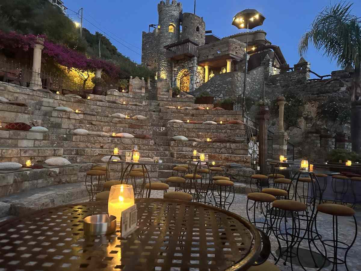 Πυργίσκοι, επάλξεις, πέτρινες σκάλες και λιακωτά συνθέτουν ένα σκηνικό εμπνευσμένο από τα μεσαιωνικά και βυζαντινά κάστρα, χαρίζοντας στον χώρο έναν ατμοσφαιρικό και σχεδόν κινηματογραφικό χαρακτήρα.