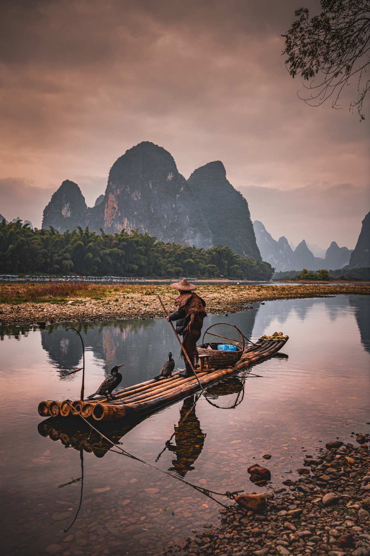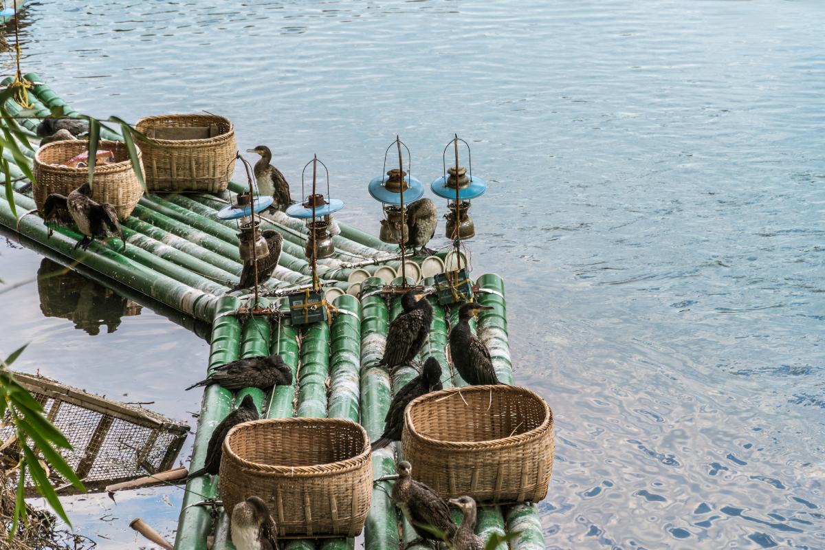 Μια σχεδία ψαρέματος κορμοράνων στον ποταμό Λι, Γκουιλίν, Κίνα. Τα πουλιά χρησιμοποιούνται σε μια παραδοσιακή κινεζική τεχνική ψαρέματος.