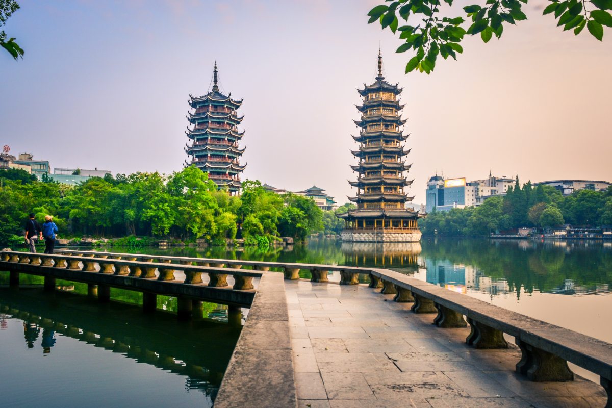 Στον παραποτάμιο δρόμο – Τοπίο με τις Δίδυμες Παγόδες Ήλιου και Σελήνης στη λίμνη Shanhu, Γκουιλίν