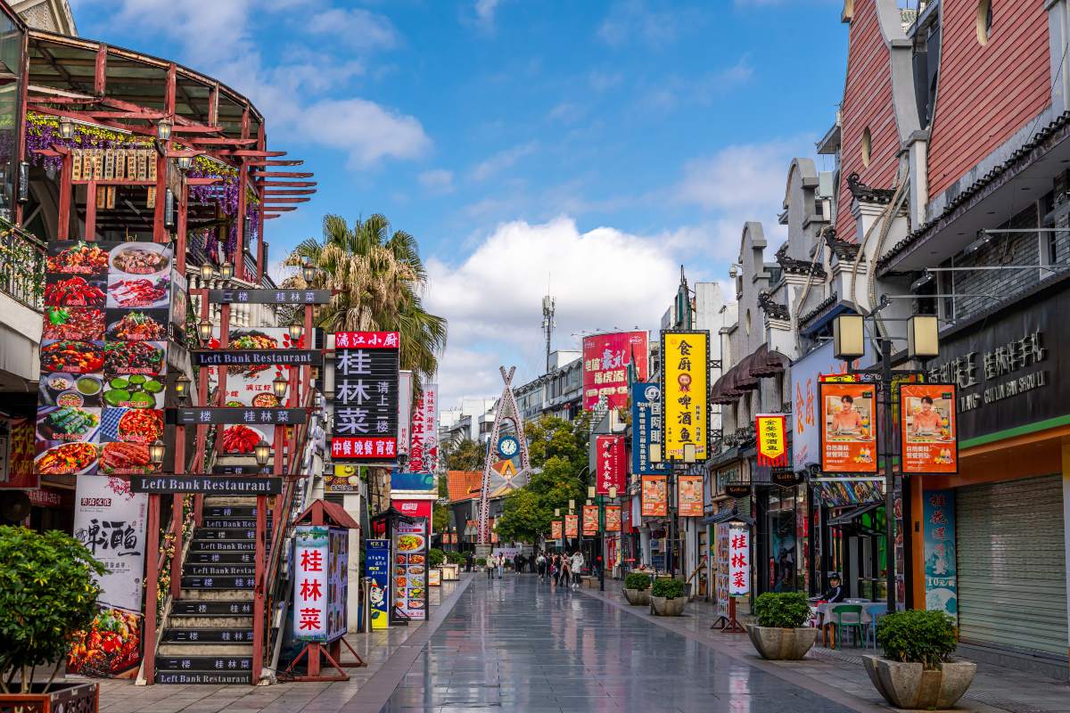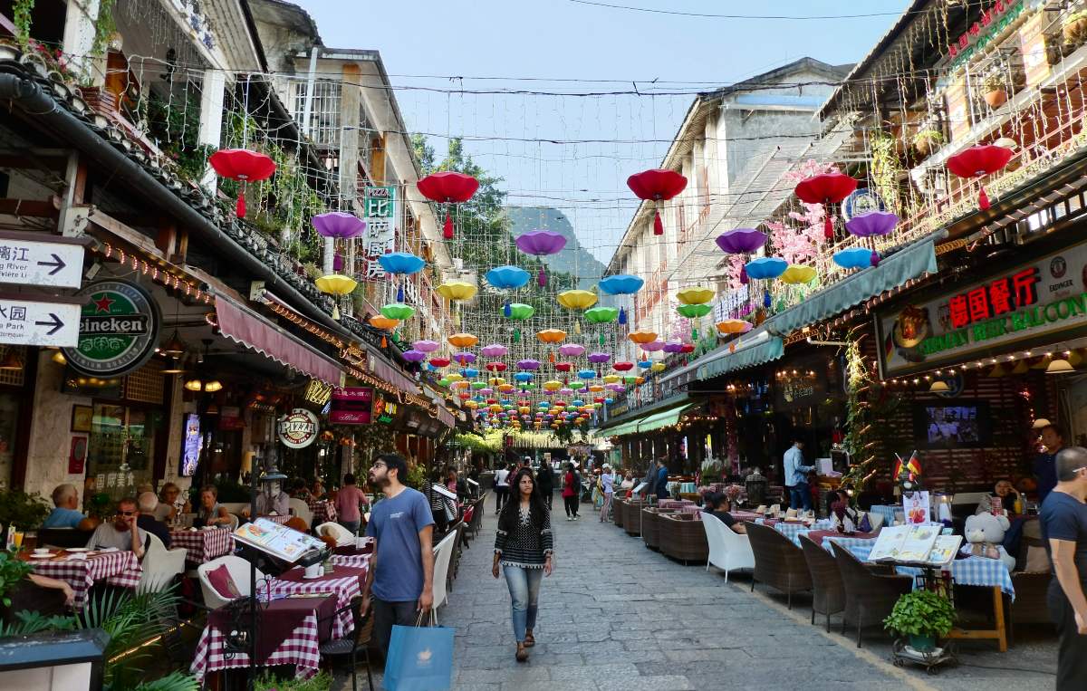 Για πιο γρήγορες και αυθεντικές γεύσεις, τα παζάρια και οι δρόμοι γύρω από το κέντρο προσφέρουν street food με νουντλς, τηγανητά ψαρικά και μικρά, καρυκευμένα πιάτα. Οι ντόπιοι περπατούν, συζητούν και απολαμβάνουν τα σνακ τους δίπλα στα κανάλια ή στα μονοπάτια του ποταμού Λι, και οι επισκέπτες μπορούν να ζήσουν μια πιο καθημερινή, άμεση εμπειρία της γεύσης.