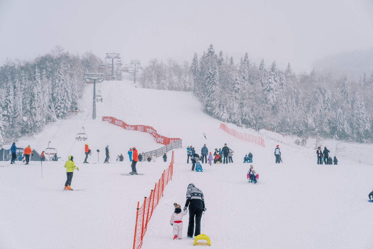 Γονείς με παιδιά κάνουν σκι κατά μήκος της χιονοδρομικής πίστας στο θέρετρο Kolasin 1600 | Μαυροβούνιο