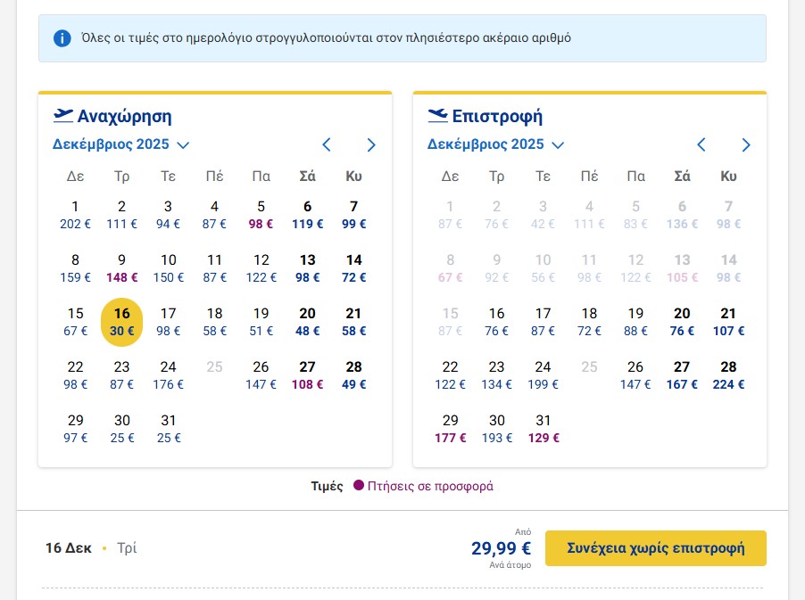 Από τους προορισμούς της προσφοράς κάναμε μια ενδεικτική αναζήτηση για ταξίδι από την Αθήνα στη Βιέννη και οι τιμές του Δεκεμβρίου σε συγκεκριμένες ημερομηνίες είναι εξαιρετικές, δεδομένου ότι μιλάμε για ένα προορισμό – ορισμό για τα Χριστούγεννα -πετάξτε από μόλις €30 ενώ και για την επιστροφή, όπως θα δείτε και στον πίνακα παρακάτω, οι τιμές ξεκινούν από €67.