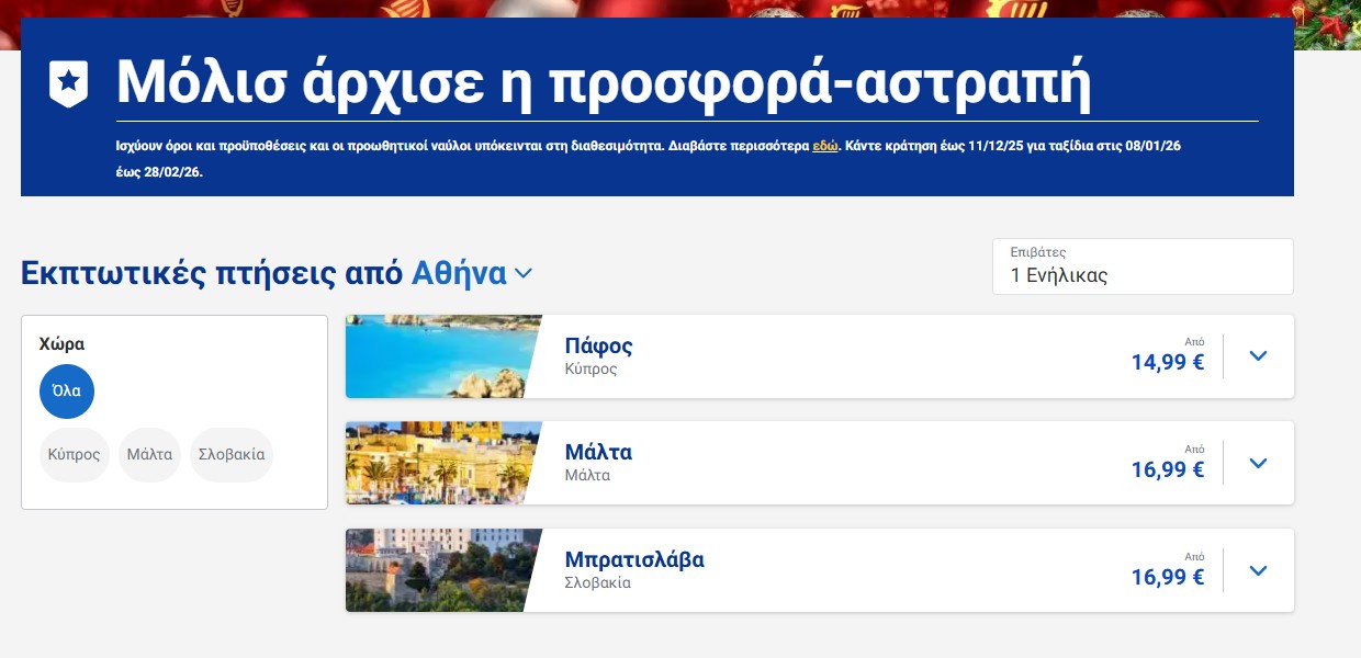 Η Ryanair έχει σταθερά κάποιες προσφορές για προορισμούς στο εξωτερικό, εξασφαλίζοντας χαμηλούς ναύλους και οικονομικά ταξίδια. Αυτή τη φορά η νέα προσφορά γίνεται εν όψει Χριστουγέννων και αφορά σε αεροπορικά εισιτήρια από €16,99.