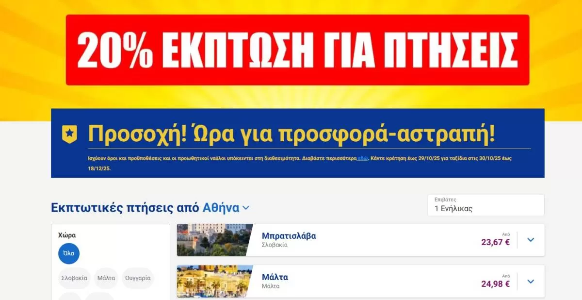 Η Ryanair έχει σταθερά κάποιες προσφορές για προορισμούς στο εξωτερικό, εξασφαλίζοντας χαμηλούς ναύλους και οικονομικά ταξίδια. Αυτή τη φορά η νέα προσφορά αφορά εκπτωτικές πτήσεις 20% από Αθήνα για ευρωπαϊκούς προορισμούς με αεροπορικά εισιτήρια που ξεκινούν από €23,70.