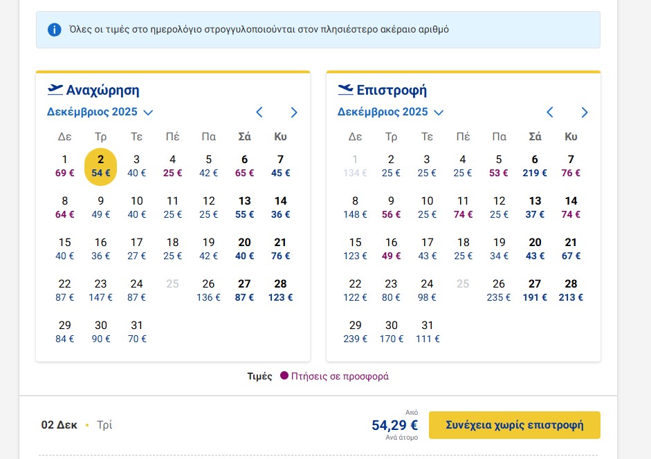 Από τους προορισμούς της προσφοράς κάναμε μια ενδεικτική αναζήτηση για ταξίδι από την Αθήνα στη Βουδαπέστη και οι τιμές του Δεκεμβρίου σε συγκεκριμένες ημερομηνίες είναι εντυπωσιακές -πετάξτε από μόλις €25 ενώ και για την επιστροφή, όπως θα δείτε και στον πίνακα παρακάτω, οι τιμές επίσης ξεκινούν από €25!
