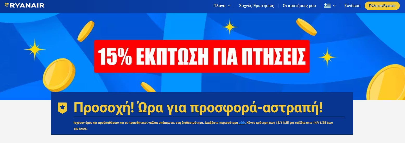 - Η προσφορά δεν ισχύει όταν η προσφορές «Αγοράστε ένα, Αποκτήστε ένα δωρεάν ή Αγοράστε ένα, Αποκτήστε ένα στη μισή τιμή», ισχύουν στο Ryanair.com.